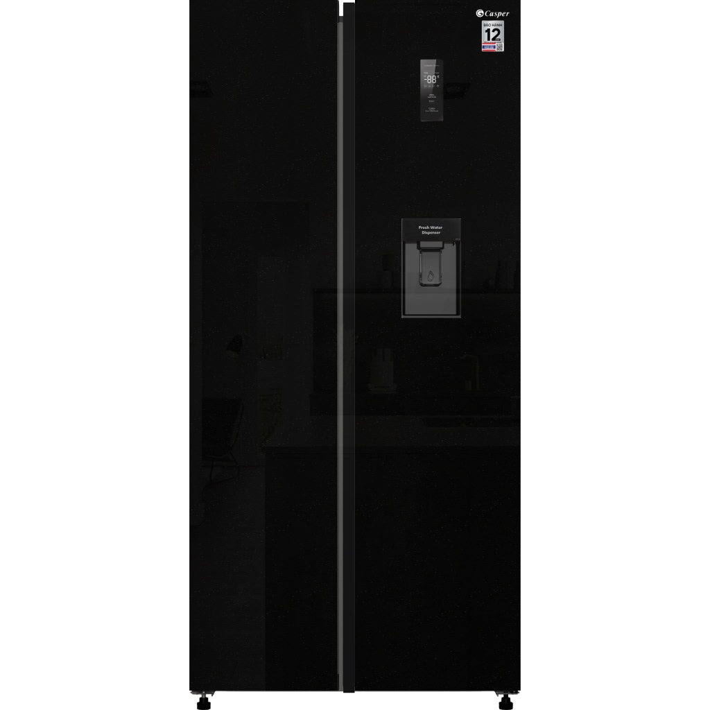 Đặc điểm sản phẩm Model: RS-D462SBS Màu sắc: Đen bóng có nền lấp lánh Nhà sản xuất: Casper Thương hiệu đến từ: Thái Lan Xuất xứ sản phẩm: Trung Quốc Năm ra mắt : 2025 Thời gian bảo hành: 24 tháng Địa điểm bảo hành: Nguyễn Kim Kiểu tủ lạnh: Side by side Số cửa tủ lạnh: 2 cửa Dung tích tổng: 495 lít Dung tích sử dụng: 460 lít Dung tích ngăn đá: 286 lít Công suất tủ lạnh: 125W Dung tích ngăn lạnh: 174 lít Đóng tuyết: Không Chất liệu khay: Kính cường lực Công nghệ làm lạnh: Multi Airflow/ Luồng khí đa chiều Chất liệu bên ngoài: Thép Công nghệ Inverter: Advanced Inverter Số sao năng lượng: 4 sao Lấy nước bên ngoài: Có Điện năng tiêu thụ: 485 kWH/năm Khối lượng sản phẩm (kg): 70 kg Kích thước sản phẩm: 830 x 610 x 1785 mm
